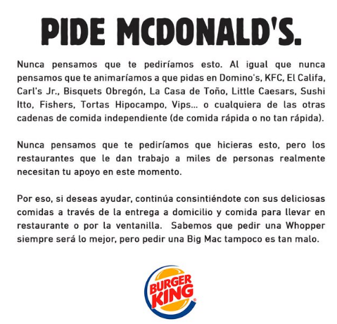 “Por eso, si deseas ayudar, continúa consintiéndote con sus deliciosas comidas a través de la entrega a domicilio y comida para llevar en restaurante o por la ventanilla. Sabemos que pedir una Whopper siempre será lo mejor, pero pedir una Big Mac tampoco en tan malo”, apuntó Burguer King.