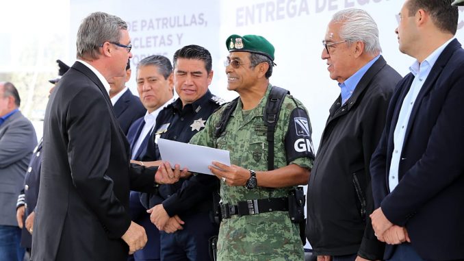 -El comandante Pedro Almazán, General Brigadier Diplomado Estado Mayor, y el gobernador Guillermo Pacheco Pulido, encabezaron la entrega de patrullas y equipamiento a la SSP y FGE.