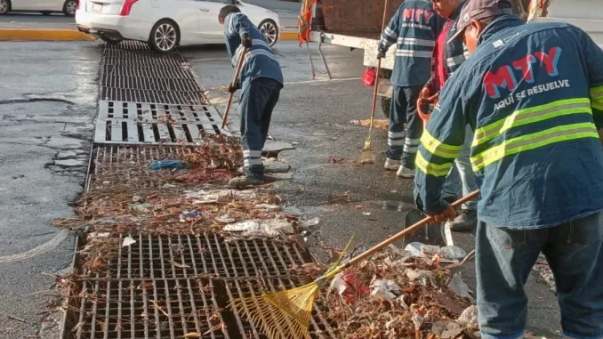 A lo largo de la ciudad el Gobierno de Monterrey desplegó durante la madrugada y esta mañana cuadrillas de trabajadores de Servicios Públicos para la limpieza de parrillas con el fin de evitar encharcamientos en calles y avenidas.