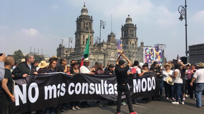 En un comunicado, las organizaciones convocantes señalaron que: “El hecho de que Andrés Manuel López Obrador quiera sentar el precedente de que mecanismos tan clara y evidentemente antidemocráticos, como la reciente consulta sobre el Aeropuerto Internacional de México, se acepten como instrumentos válidos para la toma de decisiones sobre asuntos de interés nacional, es alarmante e inaceptable”.