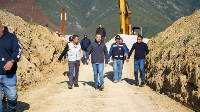 Como parte del recorrido, el alcalde supervisó también el corredor Acueducto–Antiguo Camino a Villa de Santiago, donde se desarrolla la construcción y rehabilitación de 1,250 metros lineales de avenida con tres carriles por sentido. Este frente de obra, que incorpora banquetas, guarniciones, cruces peatonales y alumbrado, registra actualmente un avance del 55 por ciento.